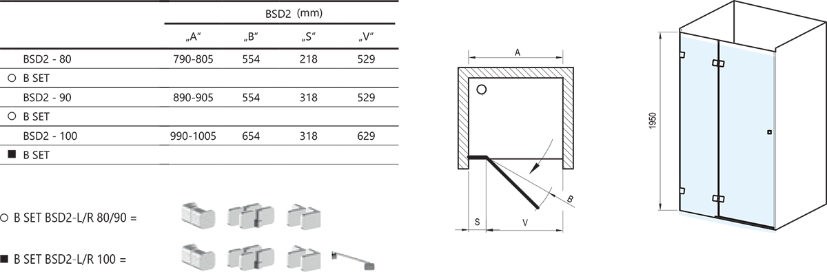 Výrobok sa skladá v dvoch pevných dielov, z ktorých jeden diel tvorí otočné dvere. Zdvihový mechanizmus zaistí aretáciu dverí v základnej polohe, ich automatické dovieranie a nadvihnutie nad prahovú lištu pri otváraní. Ľavá alebo pravá varianta výrobku je daná umiestnením pántov otočných dverí pri pohľade zvonku. Montuje sa do obloženého rohu kúpeľne (do vymurovanej niky) na vaničky Ravak Perseus Pro, Perseus Pro Flat, Perseus Pro Chrome, Gigant Pro, Gigant Pro Flat, Gigant Pro Chrome alebo priamo na podlahu so zabudovaným odtokovým žľabom či podlahovou vpustou. Sprchové dvere BSD2 sú dodávané v zložení: sklenený kút v jednom balení. V druhom balení (B SET) sú kovové časti. Obe časti výrobku je nutné objednať samostatne (sklá + B SET).